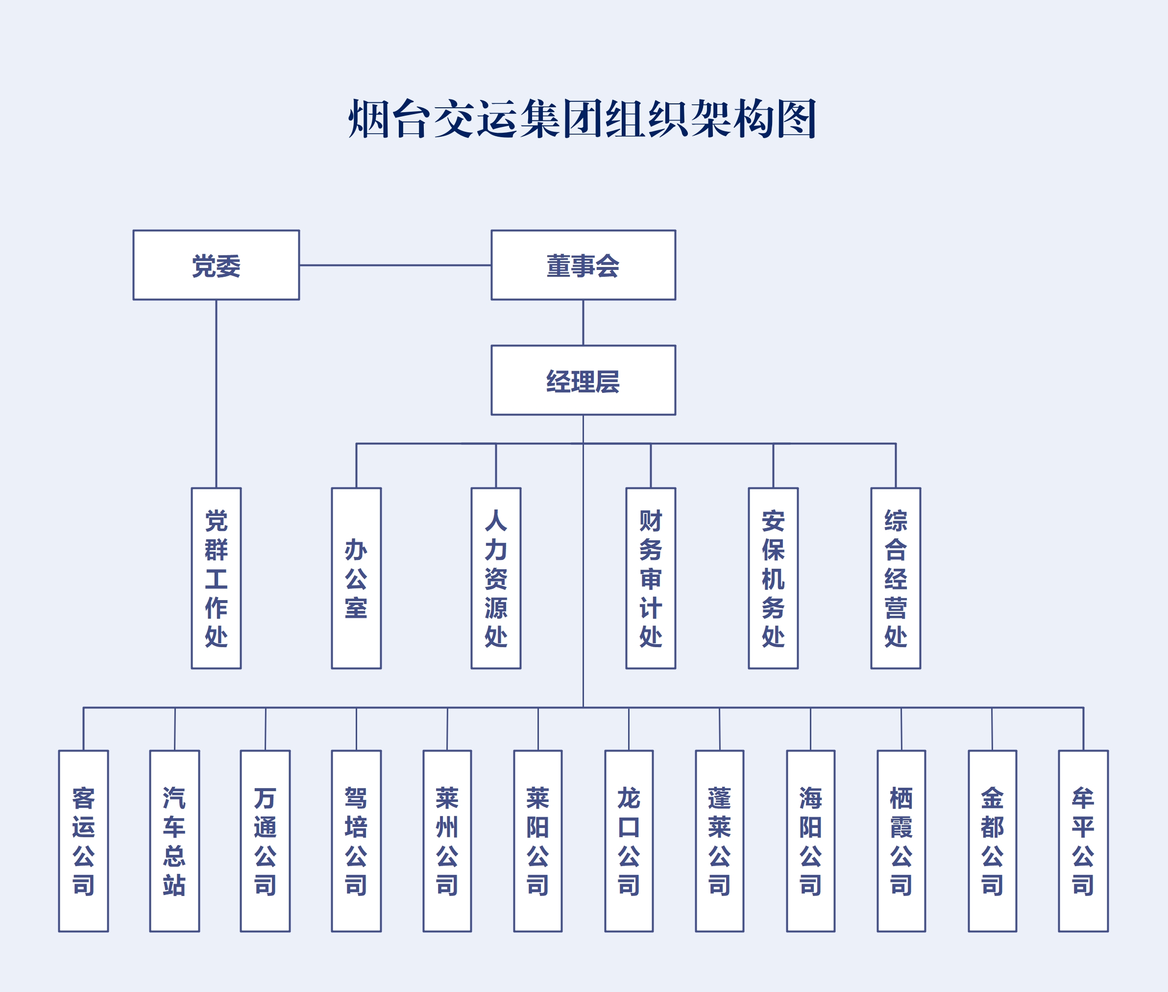 煙臺交運(yùn)集團(tuán)組織結(jié)構(gòu)模式是以直線職能制為主的經(jīng)營管理組織結(jié)構(gòu)。集團(tuán)總部設(shè)